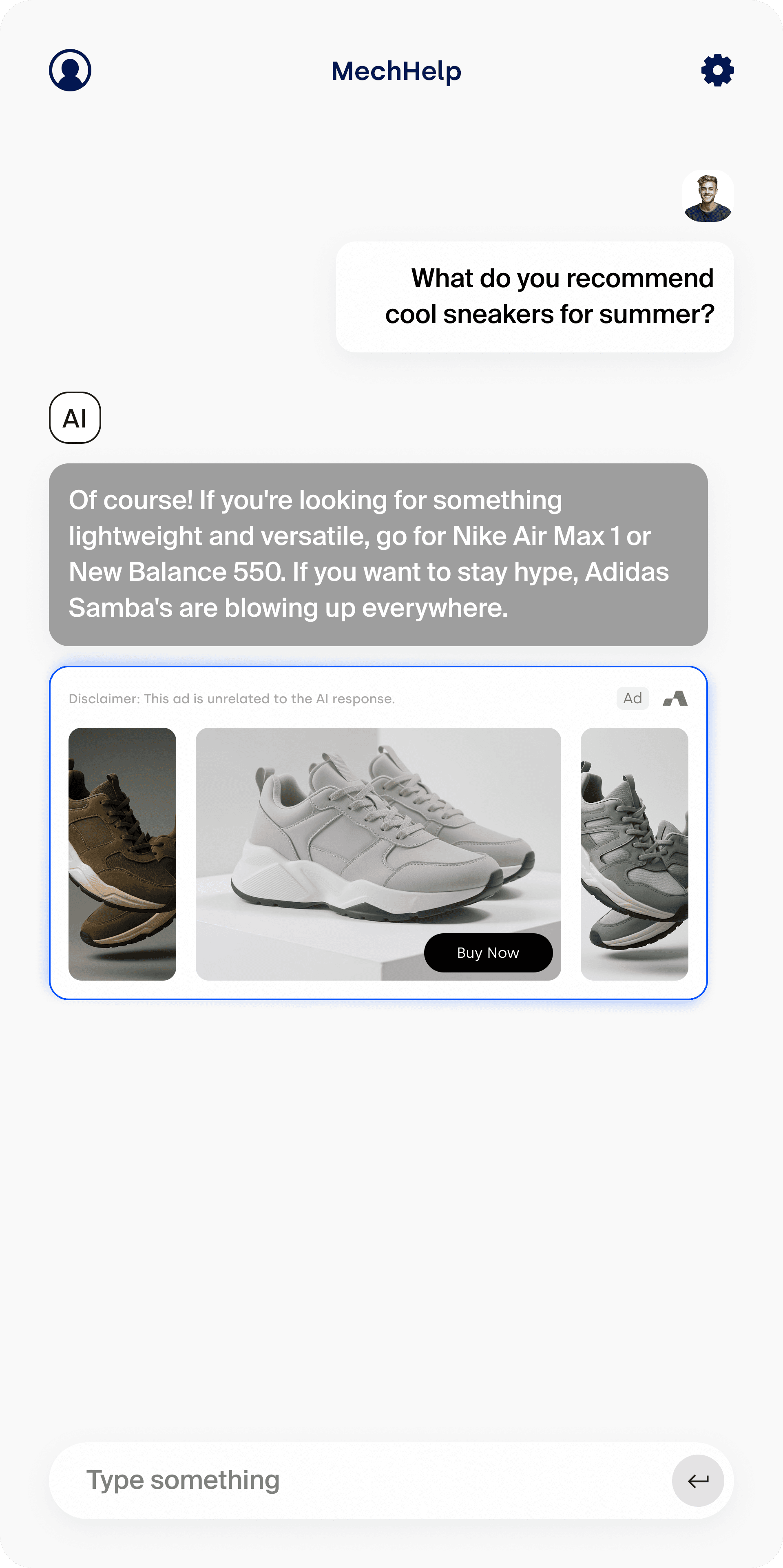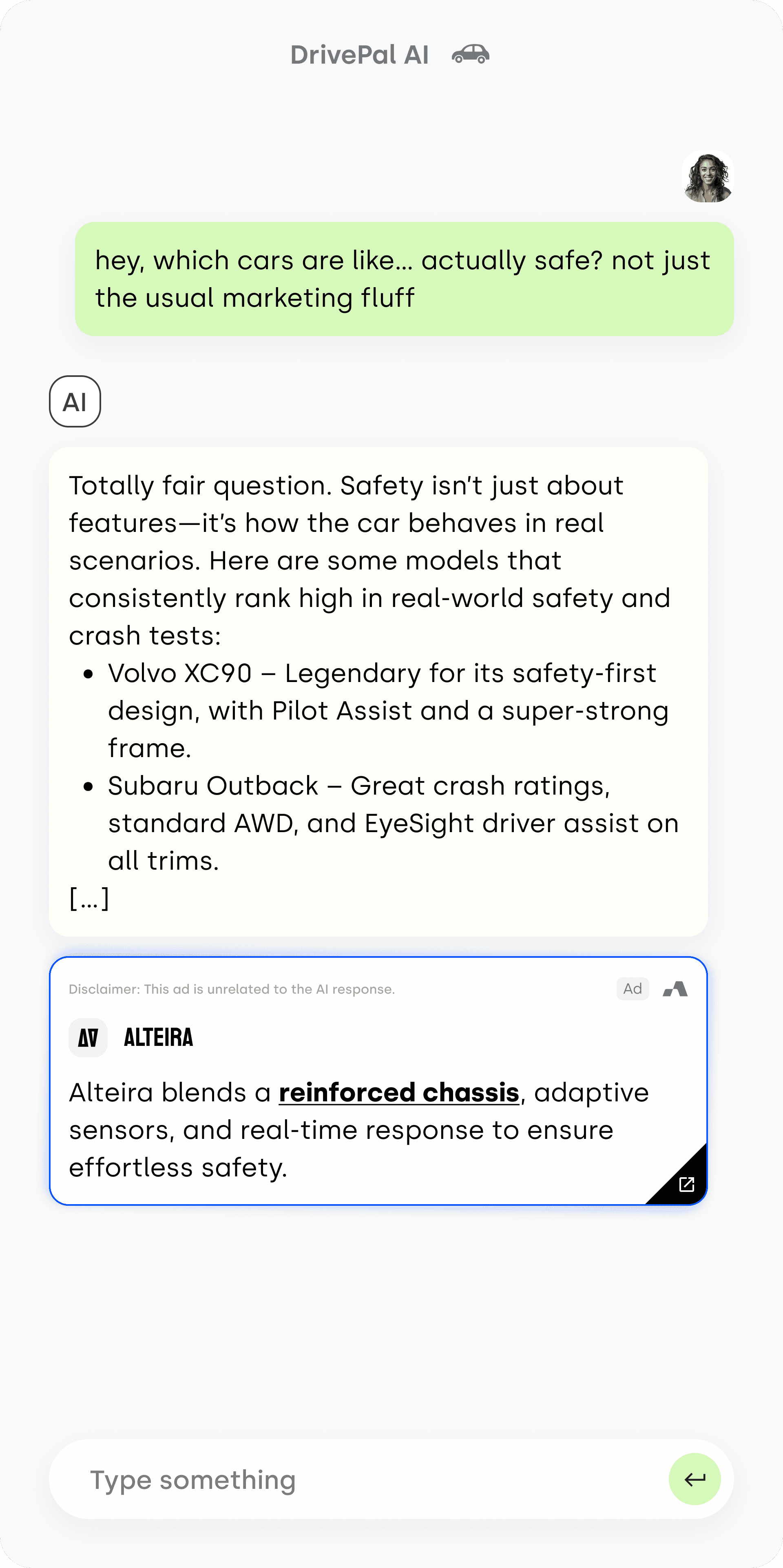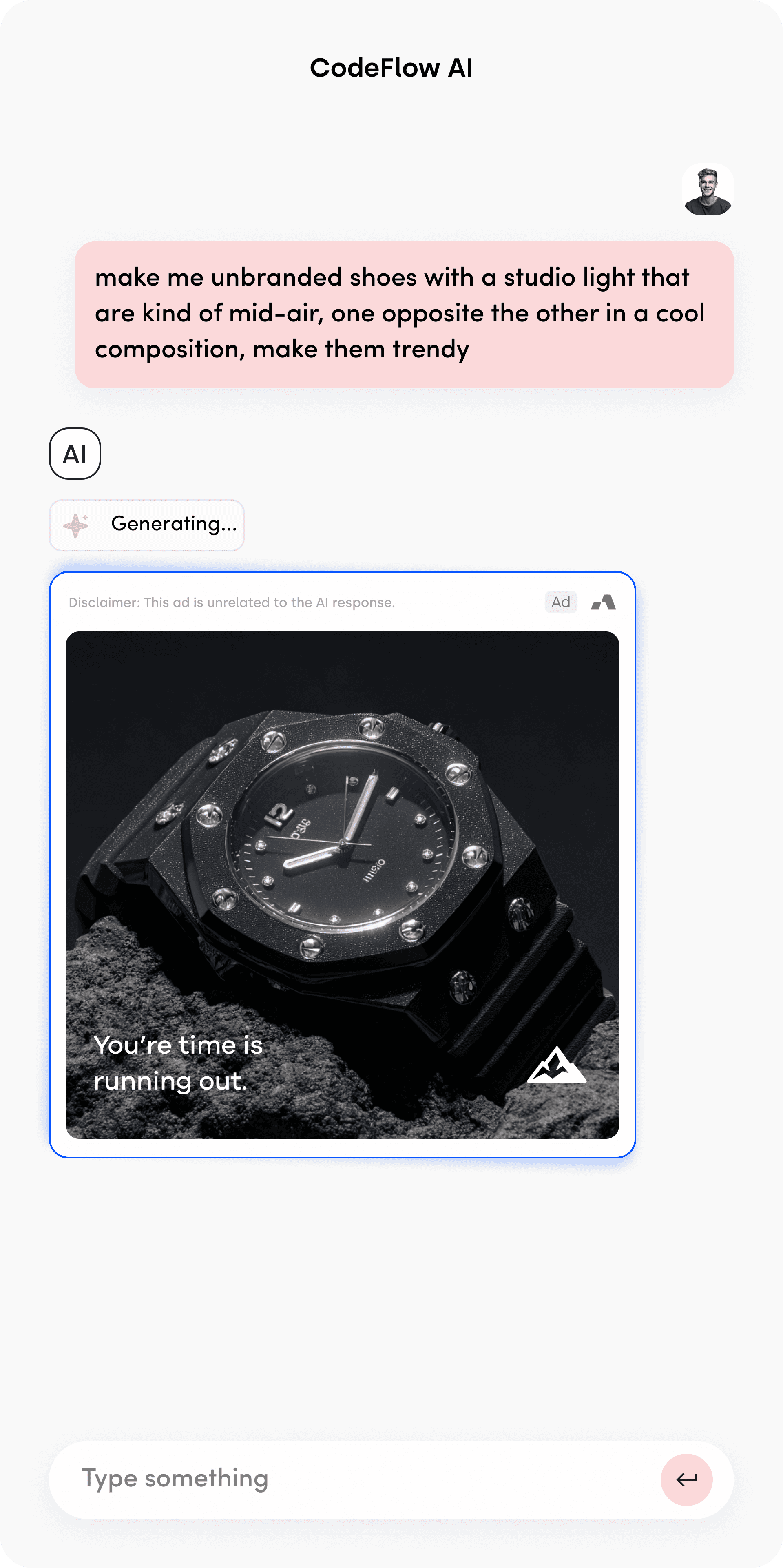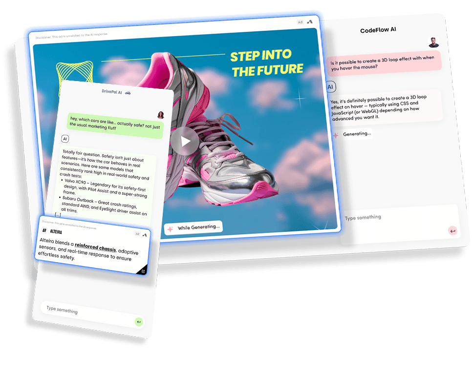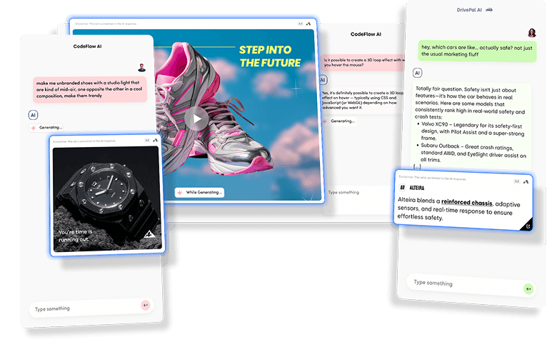 Place interactive ads inside 500M+ monthly AI chats — where discovery, exploration, and decision-making happen.