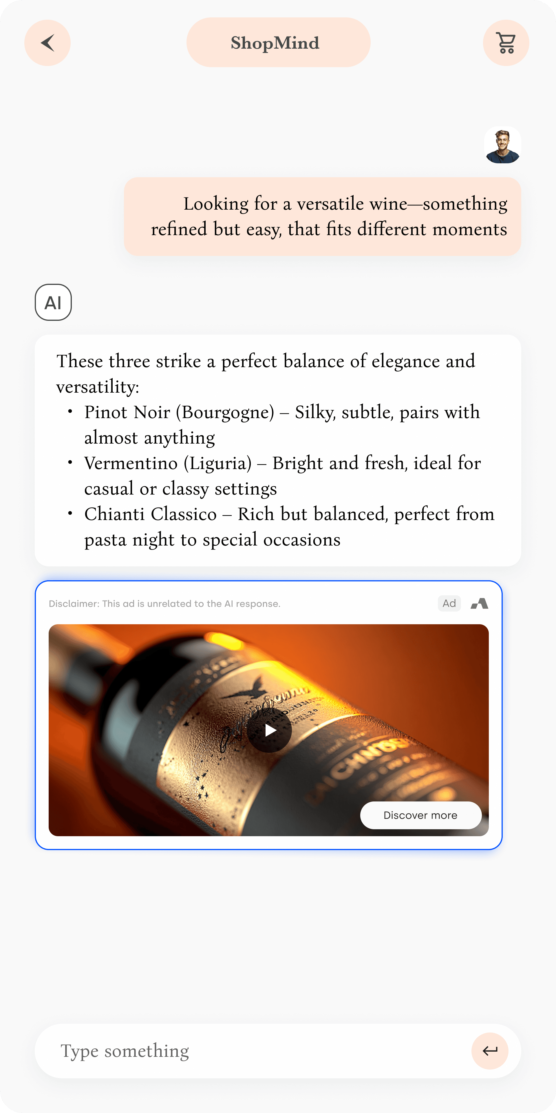 When users express a clear purchase intent aligned with your product or service - the ads are delivered as a smart, contextual recommendation at the end of the conversation.
